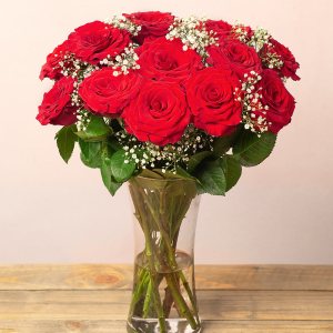 12 elegant Upper Class red Roses are beautifully complemented with stems of delicate Gypsophila, creating a simple yet stunning romantic bouquet.