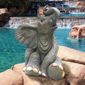 His trunk raised to symbolize good luck, our pint-sized pachyderm sculpture lends a touch of exotic African decor to your home or garden. At over three feet tall, our sitting baby elephant statue is an amazingly detailed garden centerpiece with painstakingly sculpted authentic elephant hide, oversized baby feet and a wrinkled trunk lifted in a traditional gesture of good luck. This Design Toscano adorable baby elephant calf, realized in a subtle yet natural palette of smoky greys, is cast in quality fiberglass reinforced designer resin. Anyone keen on wildlife will find our baby elephant garden sculpture irresistible! This Design Toscano large-scale, display-quality animal sculpture transforms any home, garden, restaurant or hotel into something truly magnificent!