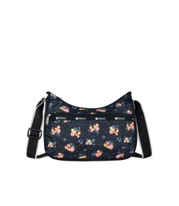 Zipped main closure, Exterior front pocket with zipped closure, Exterior back pocket with zipped closure, Interior back wall hanging zipper pocket, Adjustable shoulder strap (Max. 50in / 127cm), Includes matching pouch with zipped closure.