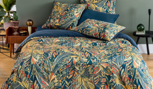 Housse de couette satin, avec cheminée, imprimé végétal multicolore sur une face et dos uni bleu nuit.