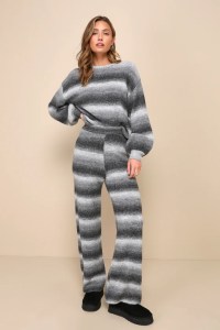 Recharging your social battery just got cuter with the Lulus Weekend at Home Charcoal Grey Ombre Striped Pullover Sweater! Medium gauge sweater knit, with an ombre striped effect throughout, shapes long balloon sleeves with drop shoulders and a crew neckline, all atop a relaxed-fit bodice. Ribbed knit accents the neckline, cuffs, and hem. Pair with the matching pants for a complete look!