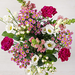We’ve perfected the recipe for the most sumptuous cream tea: take three pink Antirrhinums, Chrysanthemums and Carnations, a bunch of elegant white Lisianthus, and a generous pinch of white Hypericum berries; add a sprinkle of love and scent. Et voila!
