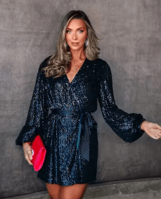 LEAVE A LITTLE SPARKLE WRAP MINI DRESS – BLACK : $68.00