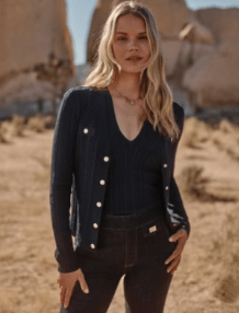 With five center snap front buttons and a V-neckline, its silhouette hits right at the waist, and works perfectly with mid- or low-rise pants and jeans. Made with our sculpted rib to add texture, you can match it back to the coordinating V-neckline sculpted rib tank.